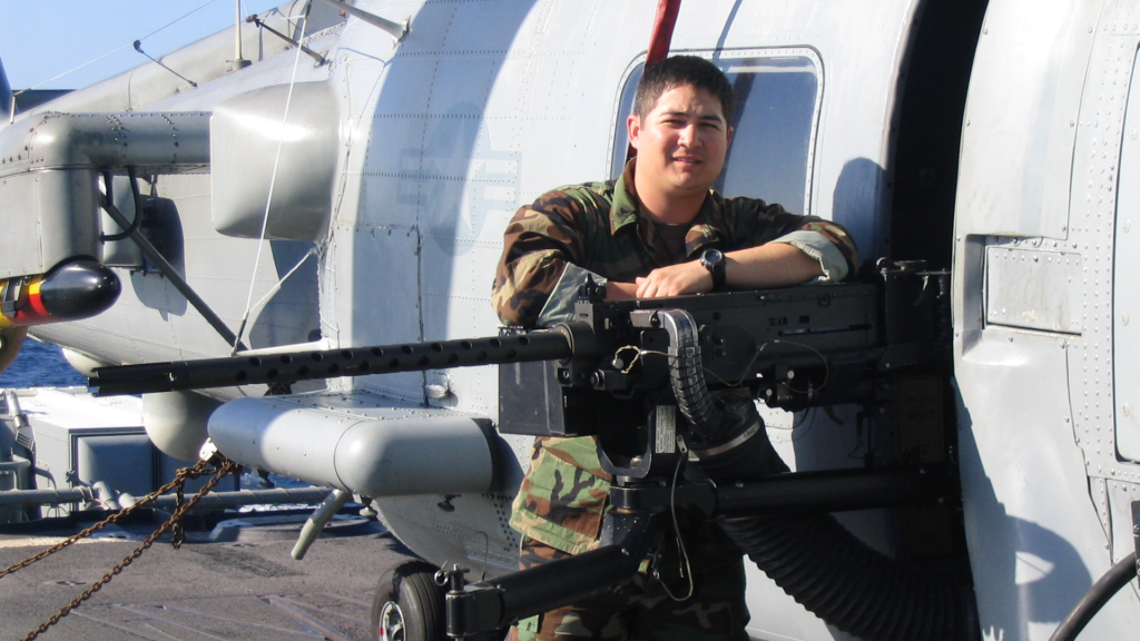 Image: Troy hanging on the flight deck with the Helo that provided air support during choke point transits for Embarked Security Team Operations.